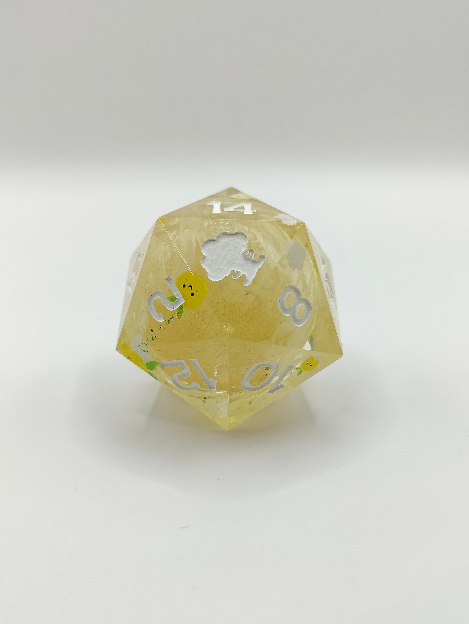 This handmade D20 was made with resin, alcohol ink, small nail stickers and mica powders. This D20 has a liquid core, a small glass orb filled with mica powder and water. It swirls around beautifully when you shake or roll the die! This D20 was made in my own molds with my custom font and logo. I put the cap face the wrong way around on this D20 so the 1 is not centered on the die face.