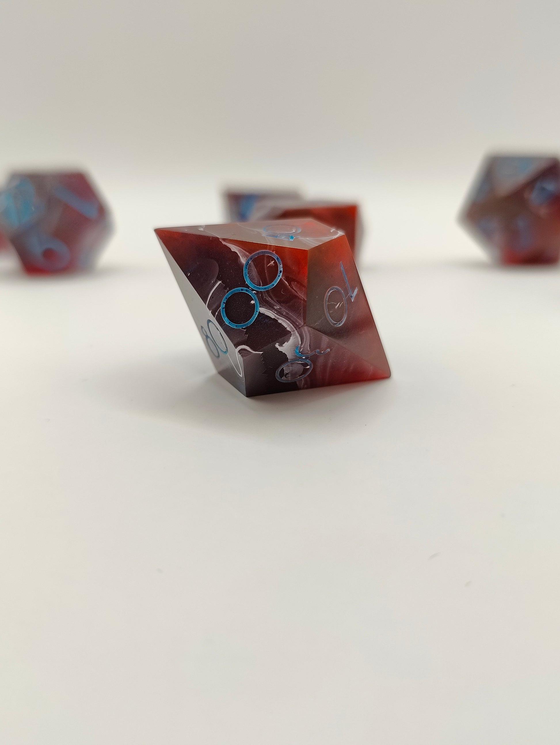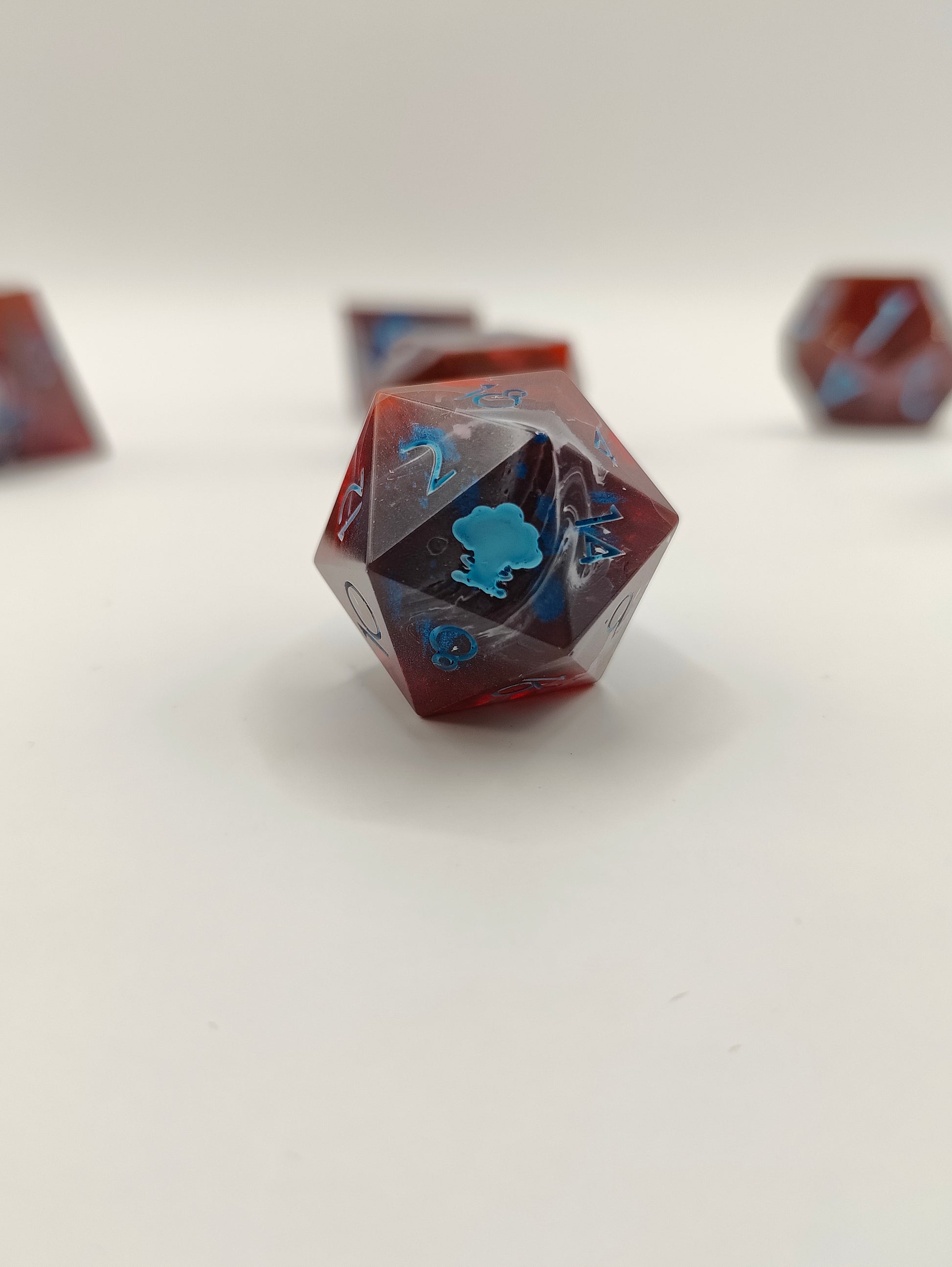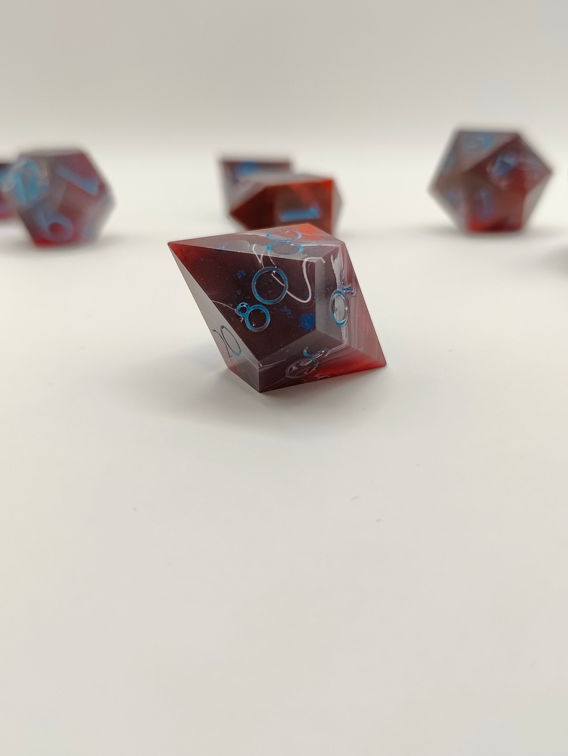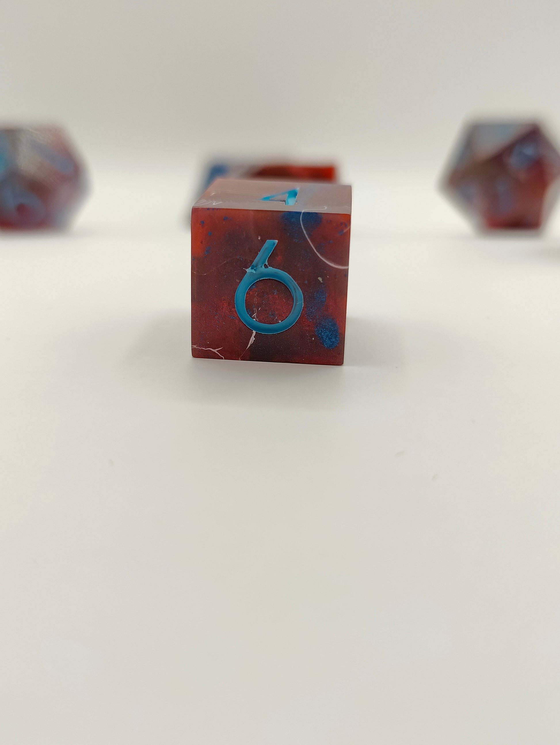 This handmade dice set was made with resin,alcohol inks, and mica powders. This set was made in a pressure pot, with my own molds, font and logo! Please look at the picture to see the Quirks this set might have. Also please note that the quirks that this set has don't at all affect the rolling and accuracy of the dice! Feel free to ask me questions!