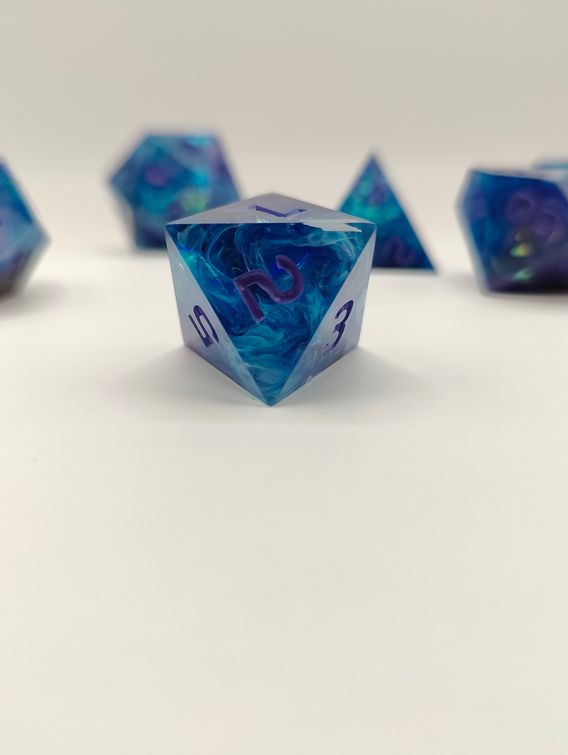 This handmade dice set was made with resin, alcohol inks, liquid glitter and mylar. This set was made in a pressure pot, with my own molds, font and logo! Please look at the picture to see the Quirks this set might have. Also please note that the quirks that this set has don't at all affect the rolling and accuracy of the dice! Feel free to ask me questions!