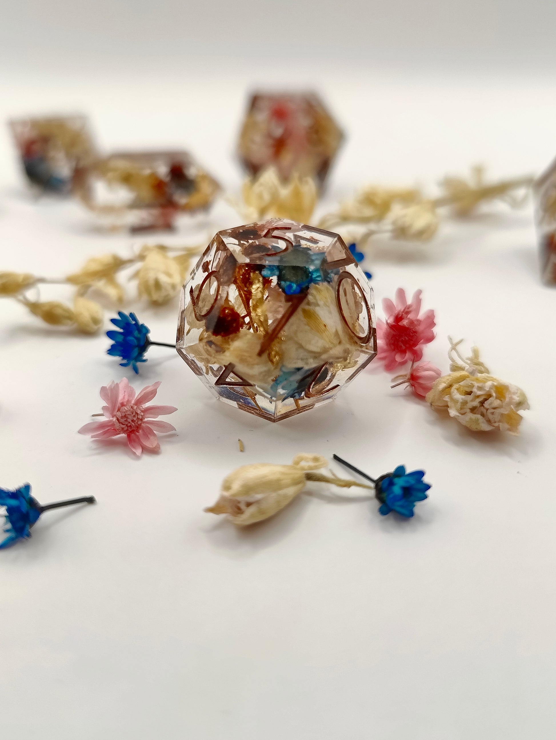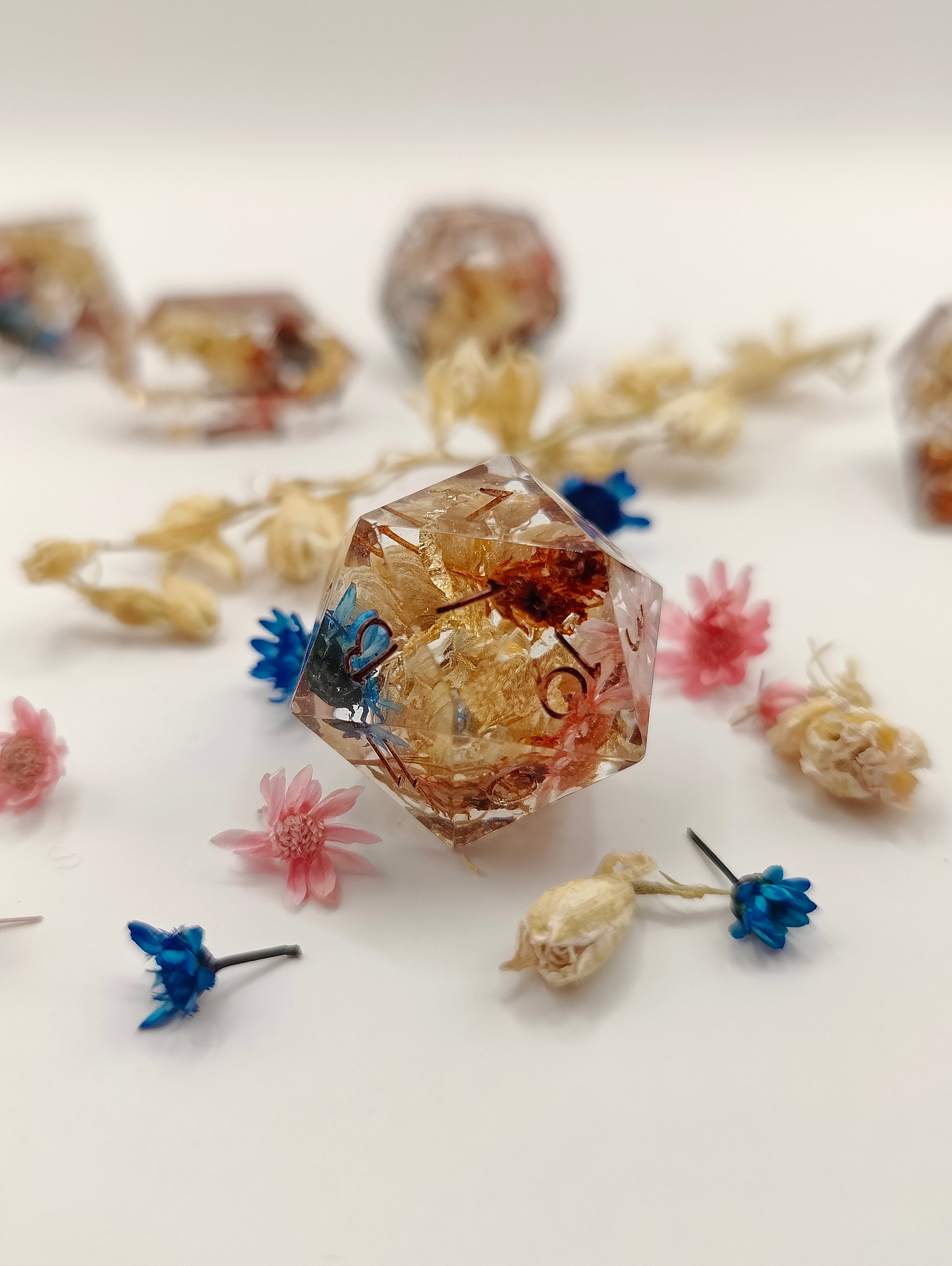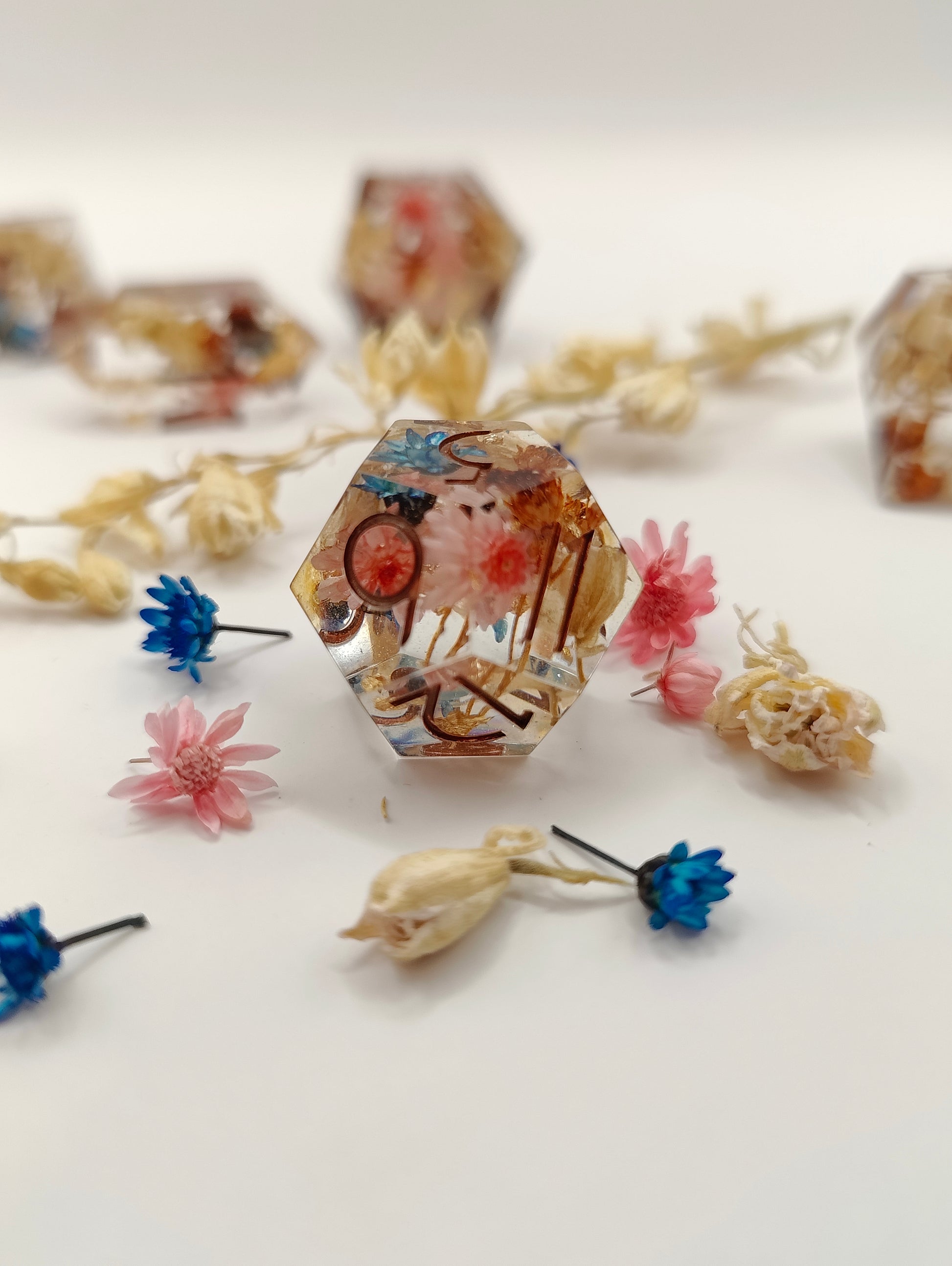 This handmade dice set was made with resin, liquid glitters and multiple dried flowers. This set was made in a pressure pot, with my own molds, font and logo! Please look at the picture to see the Quirks this set might have. Also please note that the quirks that this set has don't at all affect the rolling and accuracy of the dice! Feel free to ask me questions!!