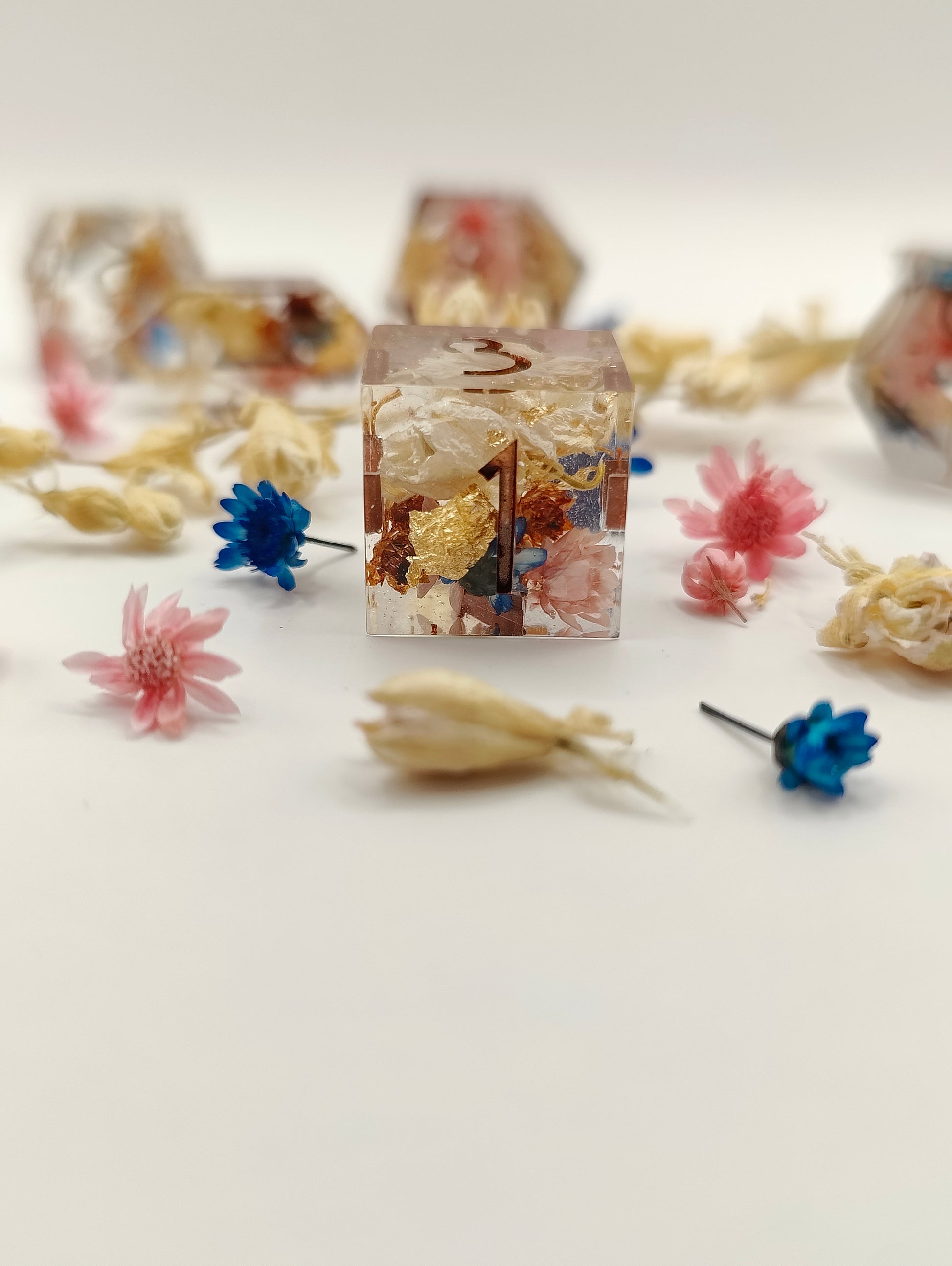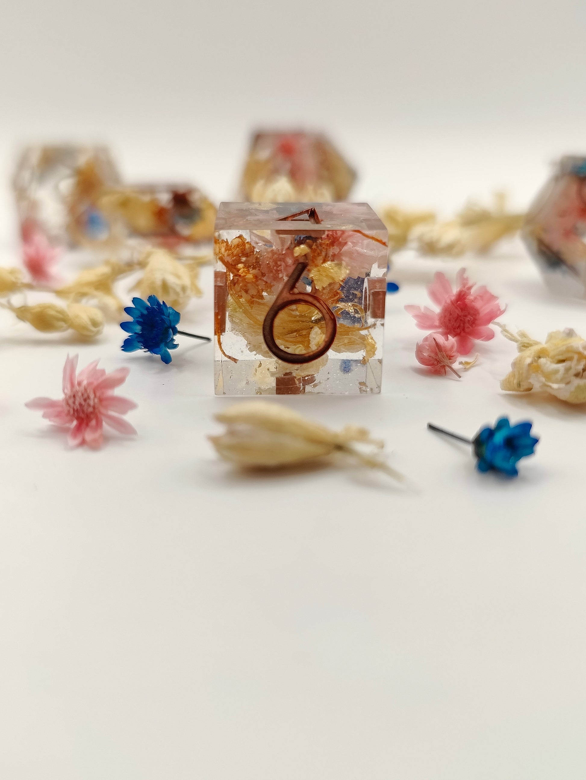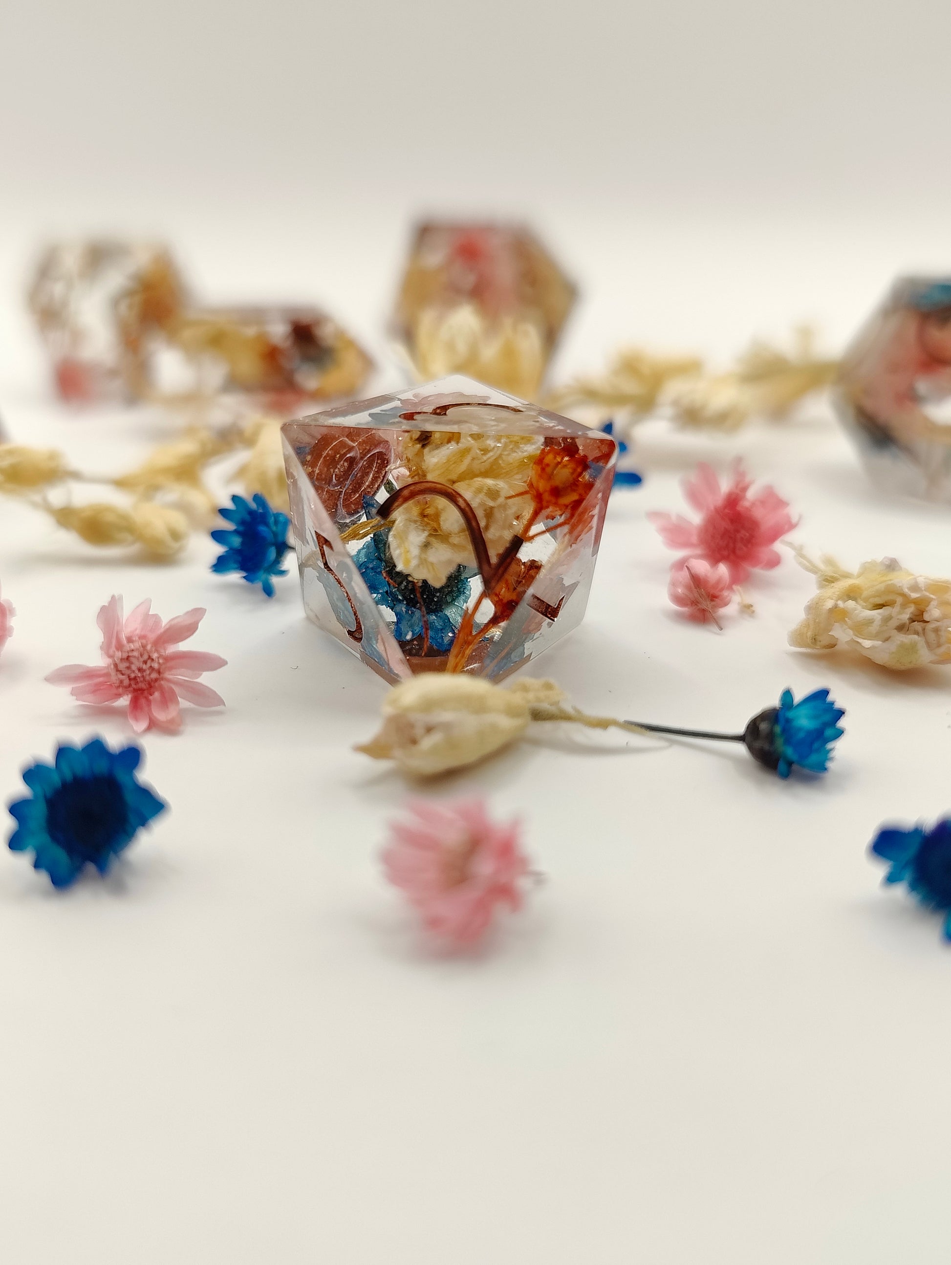 This handmade dice set was made with resin, liquid glitters and multiple dried flowers. This set was made in a pressure pot, with my own molds, font and logo! Please look at the picture to see the Quirks this set might have. Also please note that the quirks that this set has don't at all affect the rolling and accuracy of the dice! Feel free to ask me questions!!