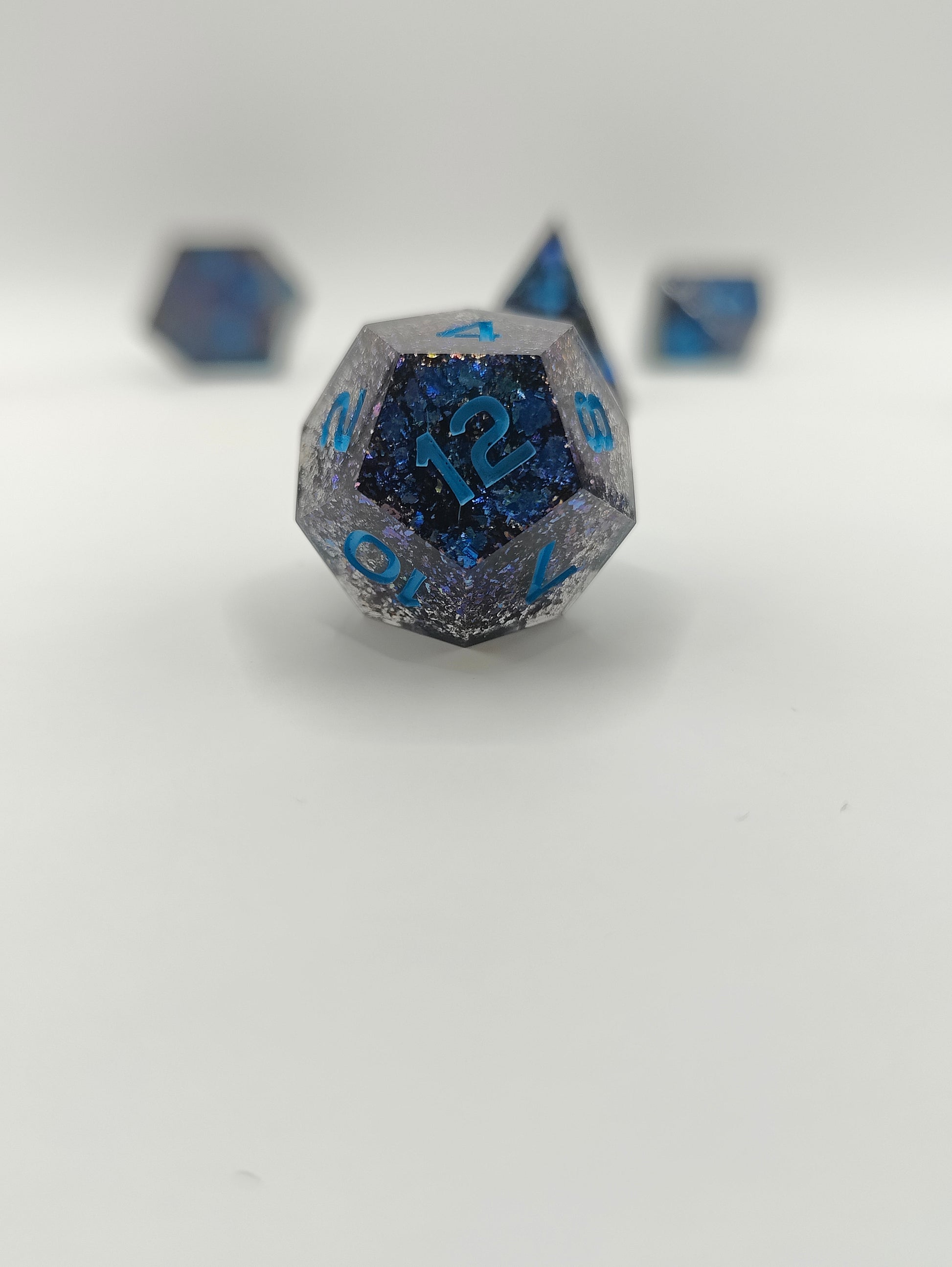 This handmade dice set was made with resin and color shifting glitters! This set was made in a pressure pot, with my own molds, font and logo! This set doesn't have any bubbles, it might have slight sanding marks. Please feel free to ask me questions!!
