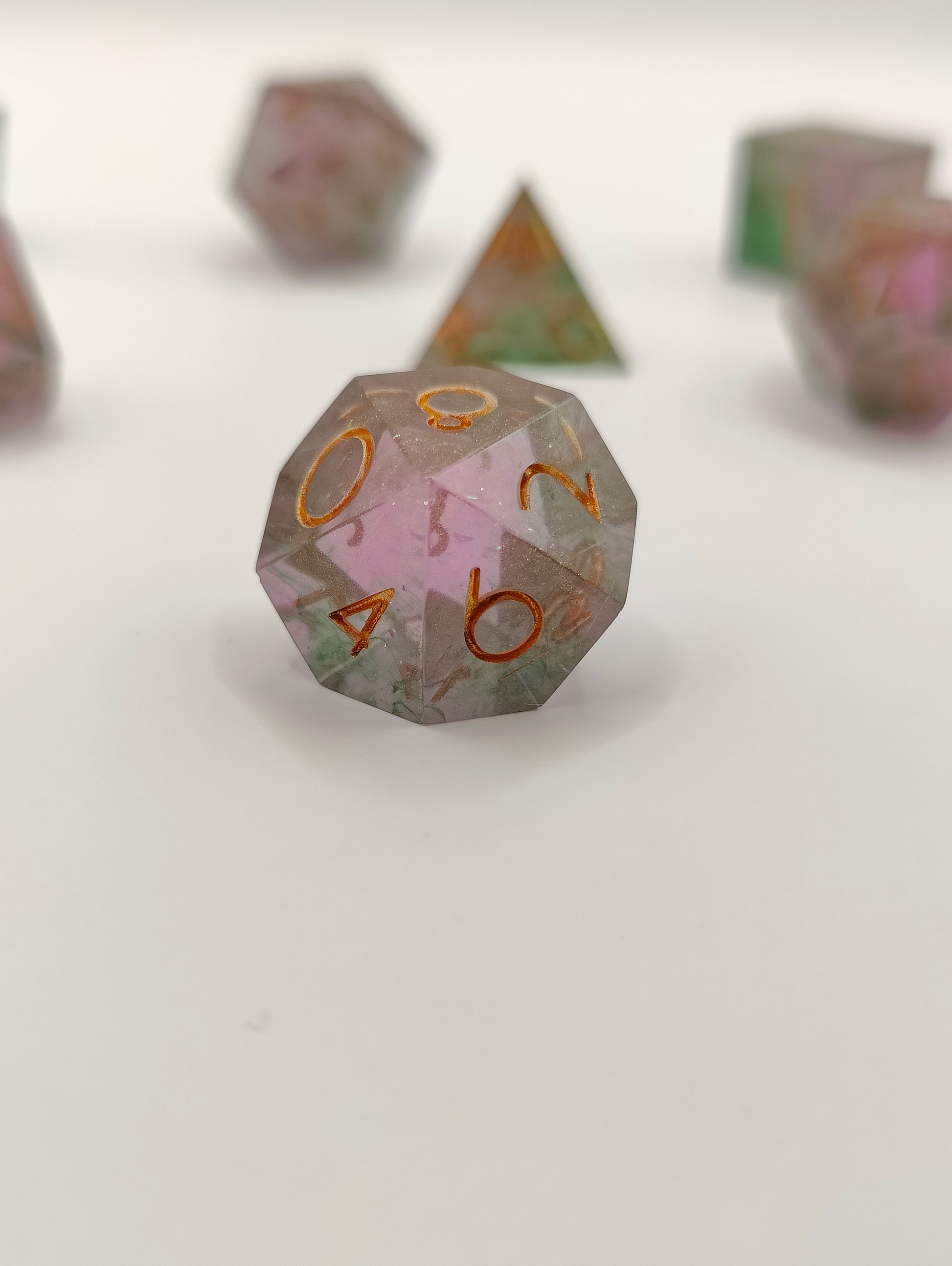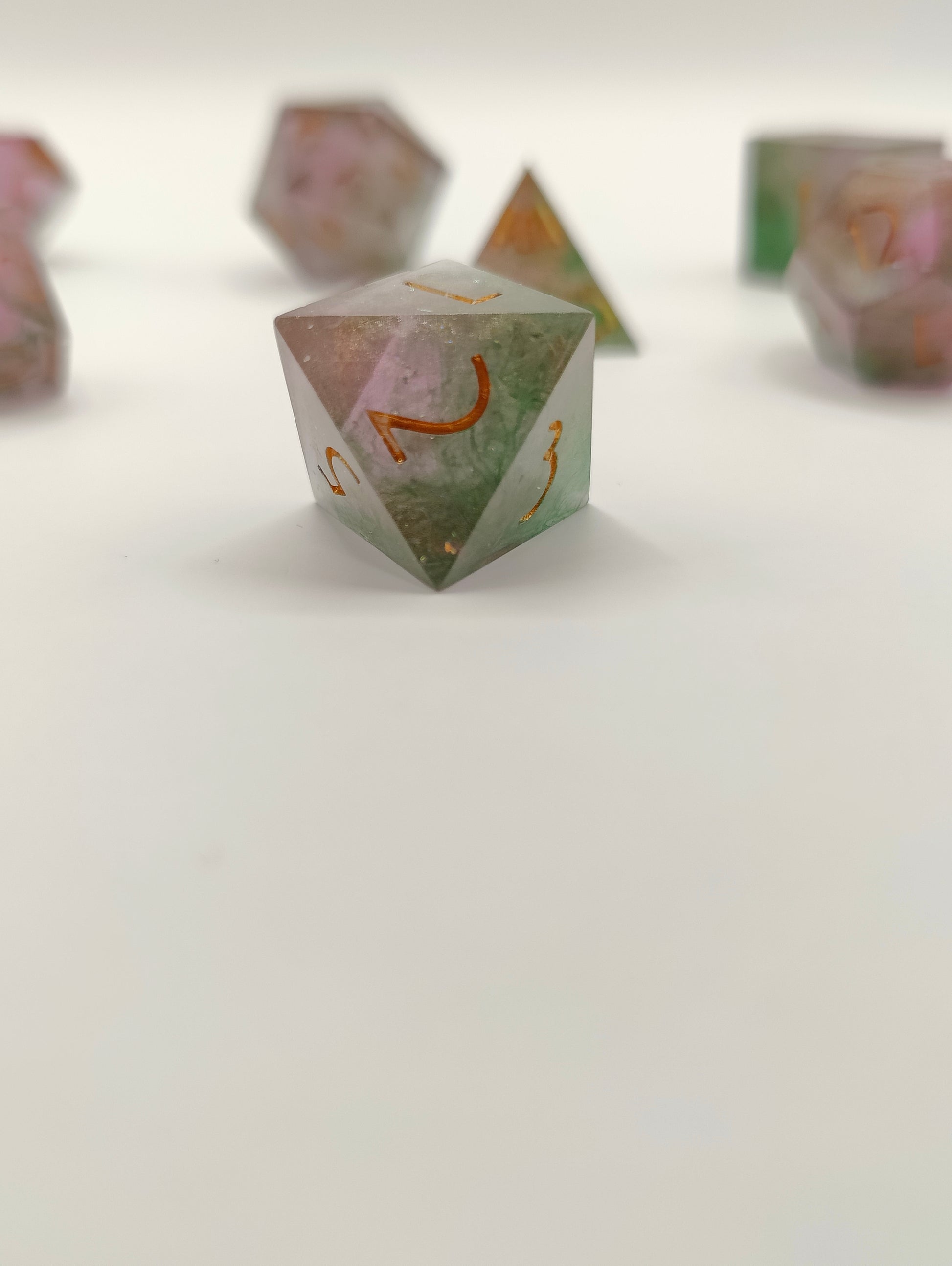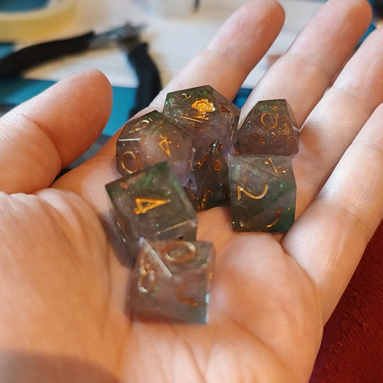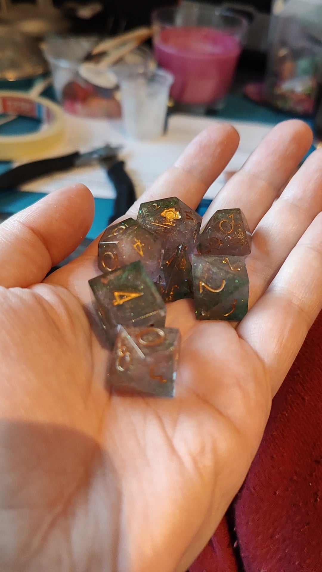 This handmade dice set was made with resin, alcohol inks, mica powder and liquid glitters. This set was made in a pressure pot, with my own molds, font and logo! Please look at the picture to see the Quirks this set might have. Also please note that the quirks that this set has don't at all affect the rolling and accuracy of the dice! Feel free to ask me questions!
