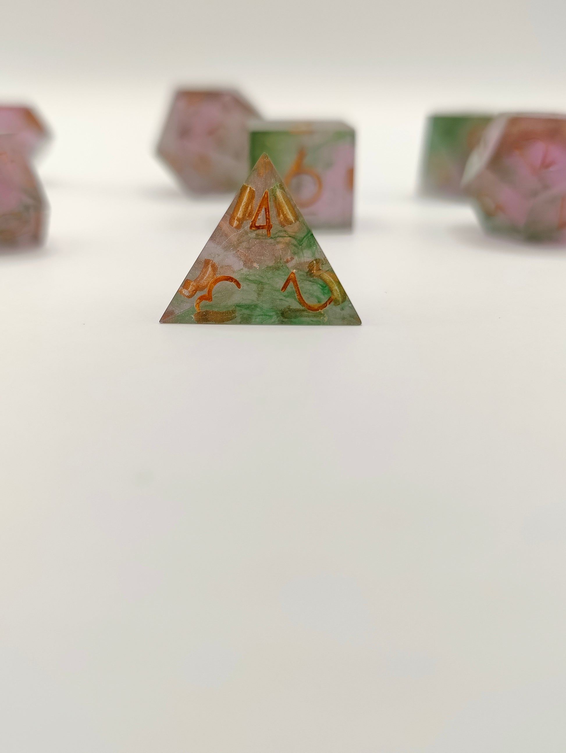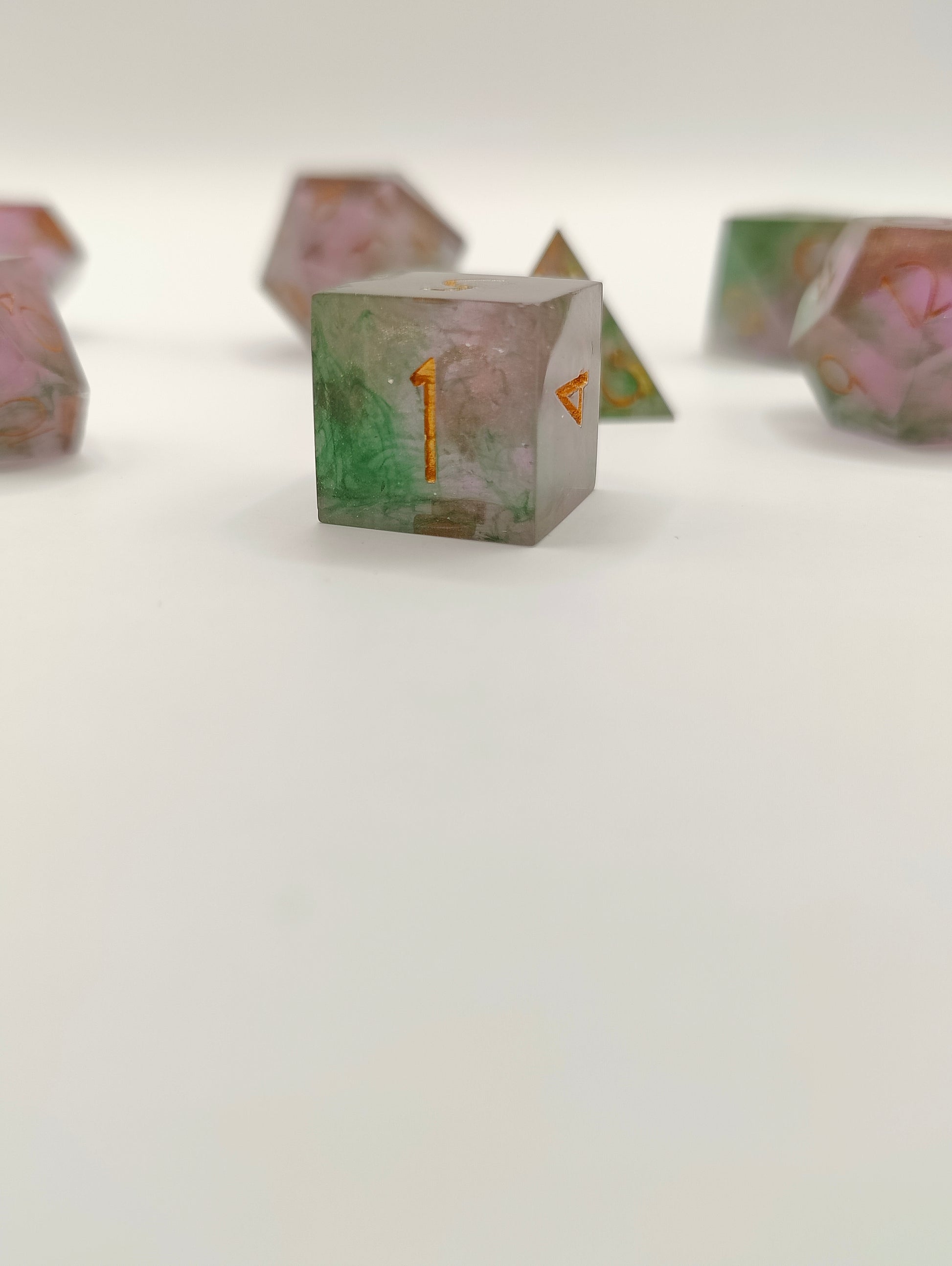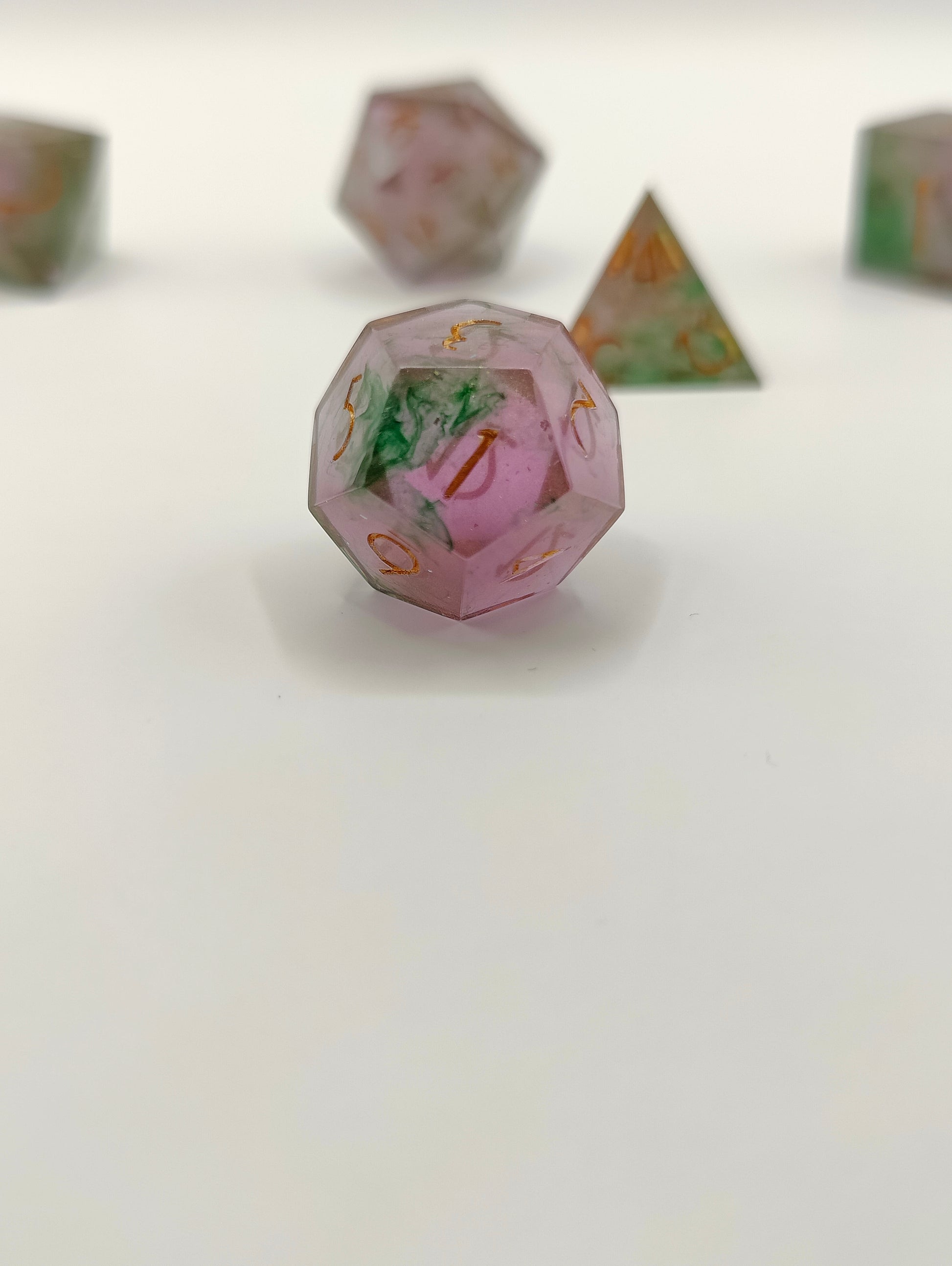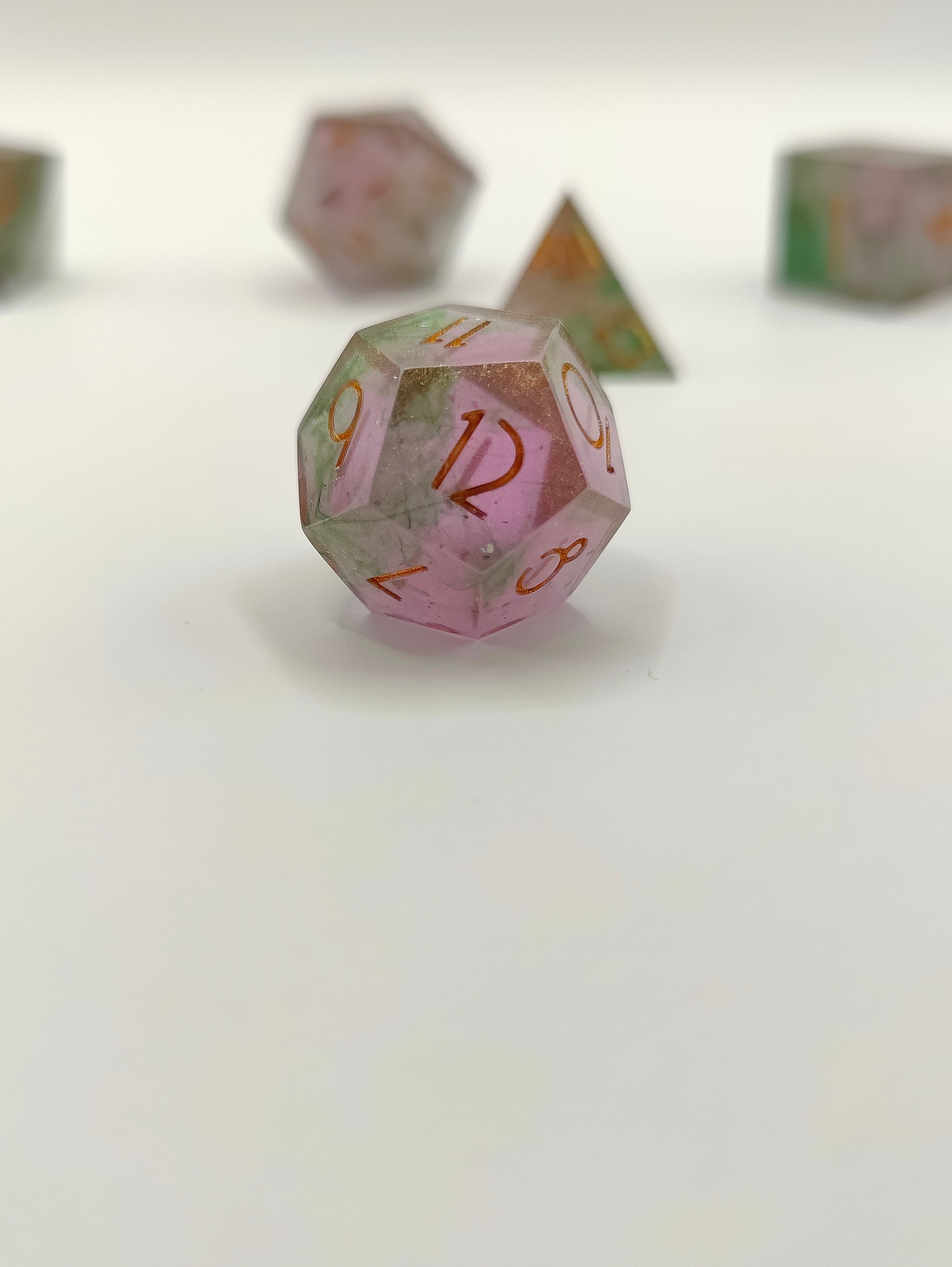 This handmade dice set was made with resin, alcohol inks, mica powder and liquid glitters. This set was made in a pressure pot, with my own molds, font and logo! Please look at the picture to see the Quirks this set might have. Also please note that the quirks that this set has don't at all affect the rolling and accuracy of the dice! Feel free to ask me questions!