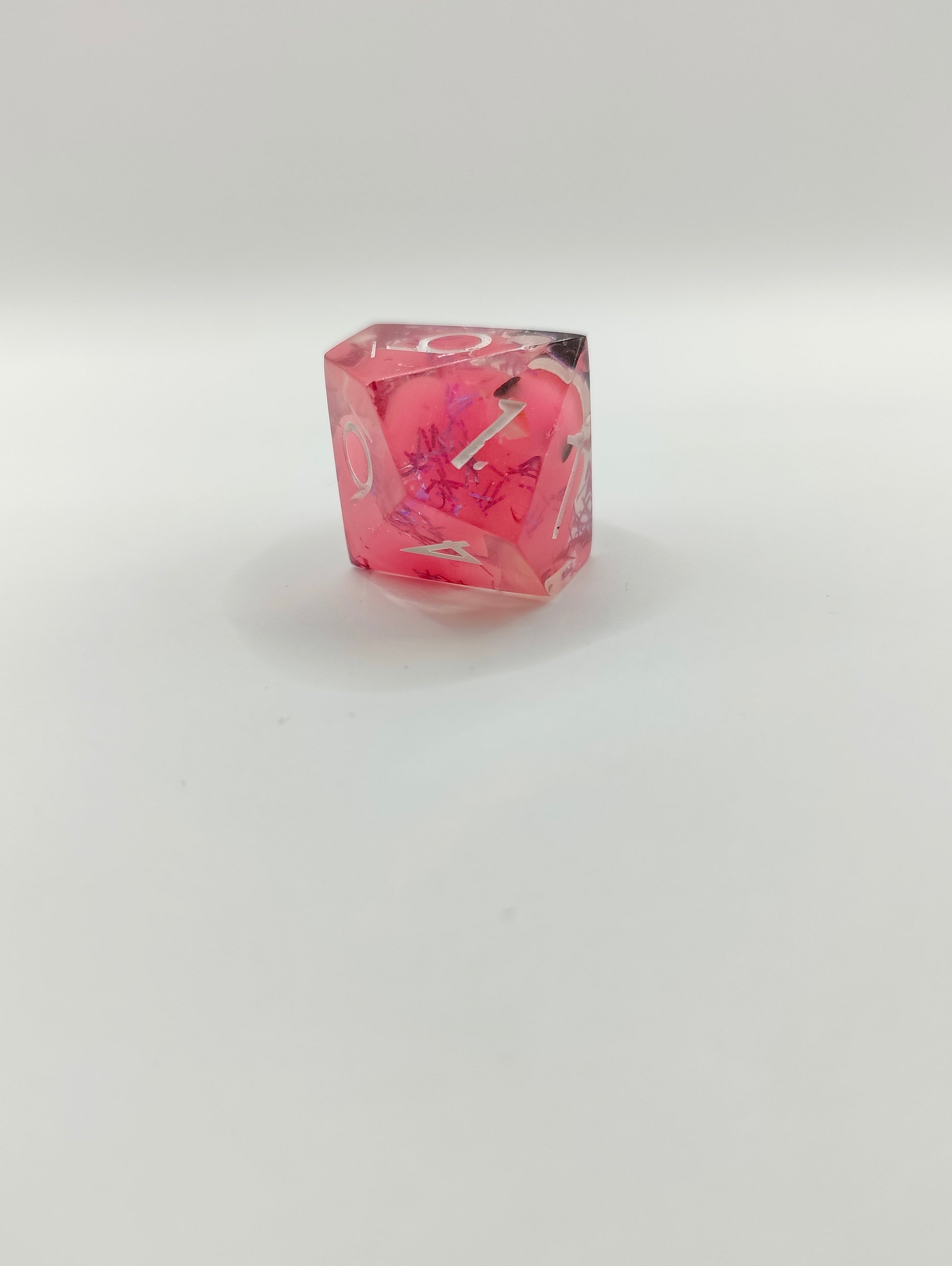 This handmade D10 was made with resin, pink glitters and a small resin flamingo. This D10 was made in a pressure pot, with my own molds, font and logo! This D10 doesn't have any bubbles, it might have slight sanding marks. Please look at the picture to see the Quirks this D10 might have. Also please note that the quirks that this D10 has don't at all affect the rolling and accuracy of the dice! Feel free to ask me questions!!