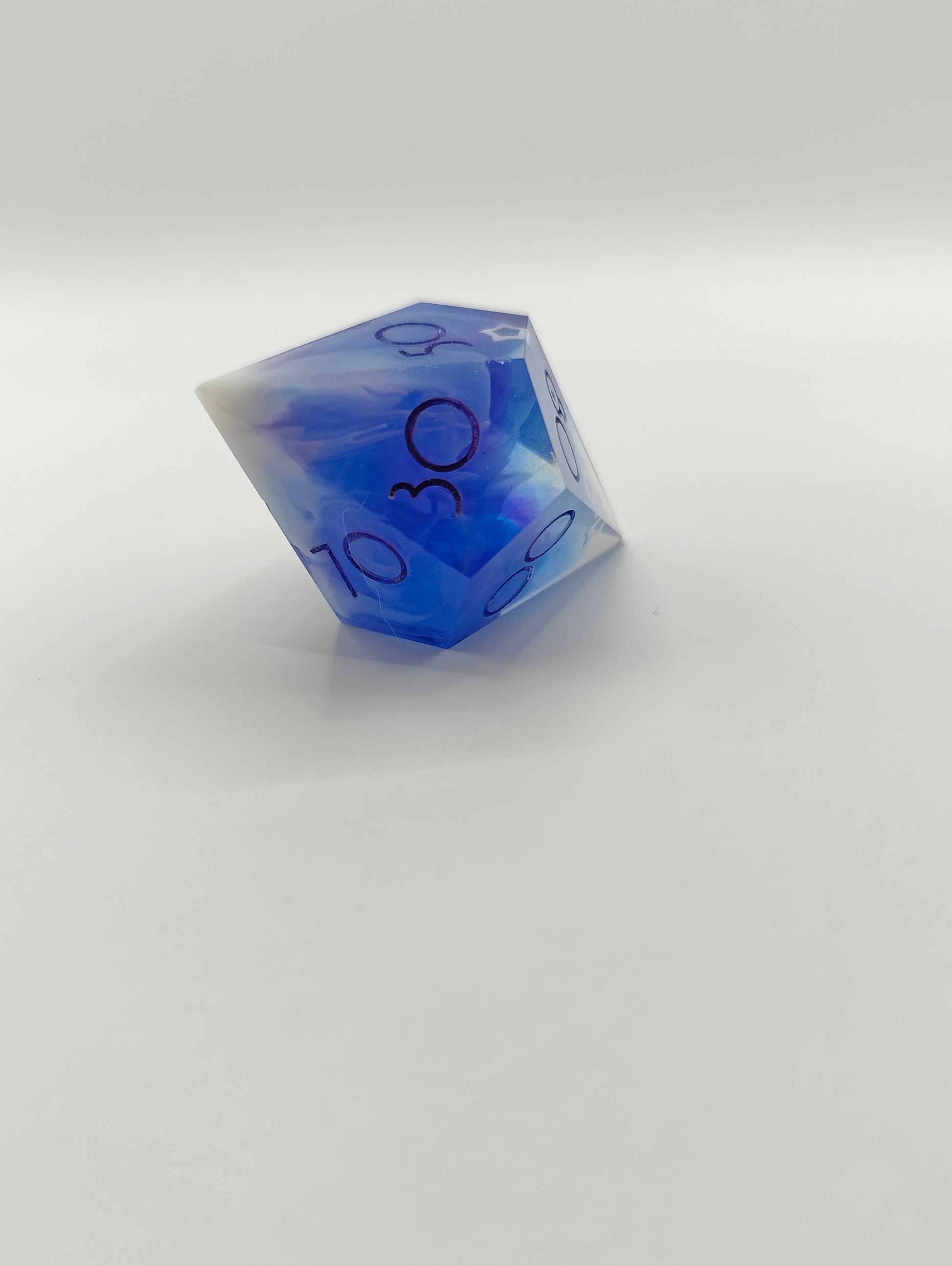This handmade D100 was made with resin, alcohol inks, liquid glitter and small star glitters. This D100 was made in a pressure pot, with my own molds, font and logo! This D100 doesn't have any bubbles, it might have slight sanding marks. Please look at the picture to see the Quirks this D100 might have. Also please note that the quirks that this D100 has don't at all affect the rolling and accuracy of the dice! Feel free to ask me questions!!
