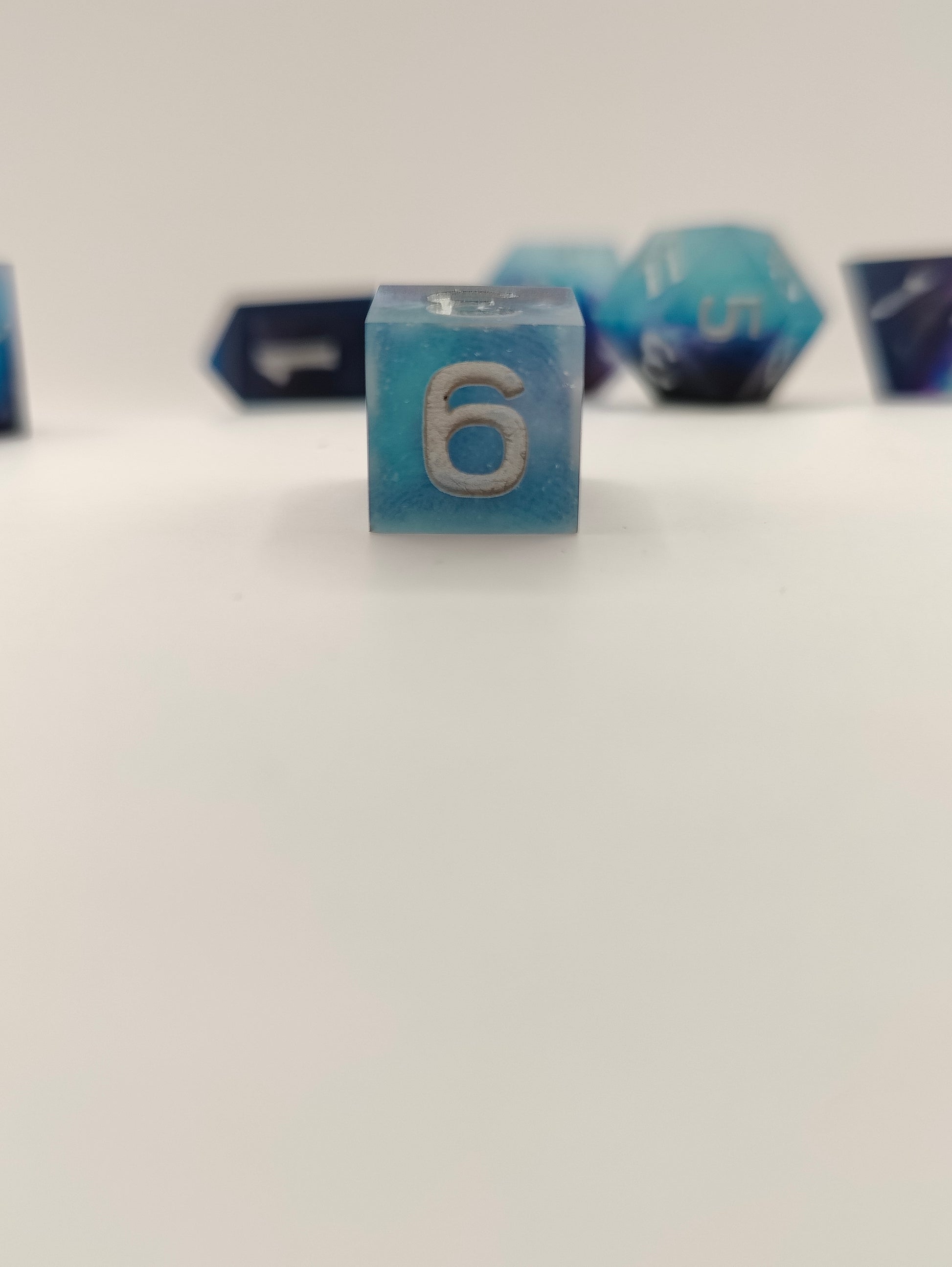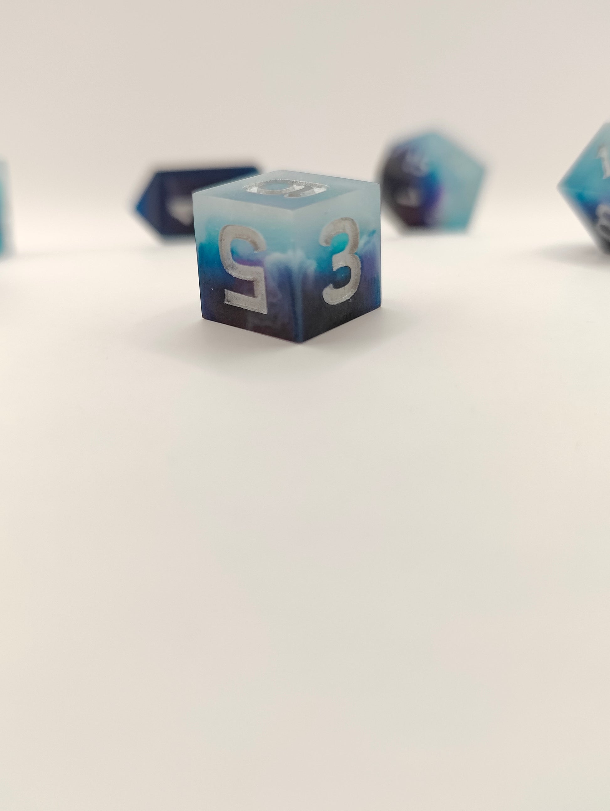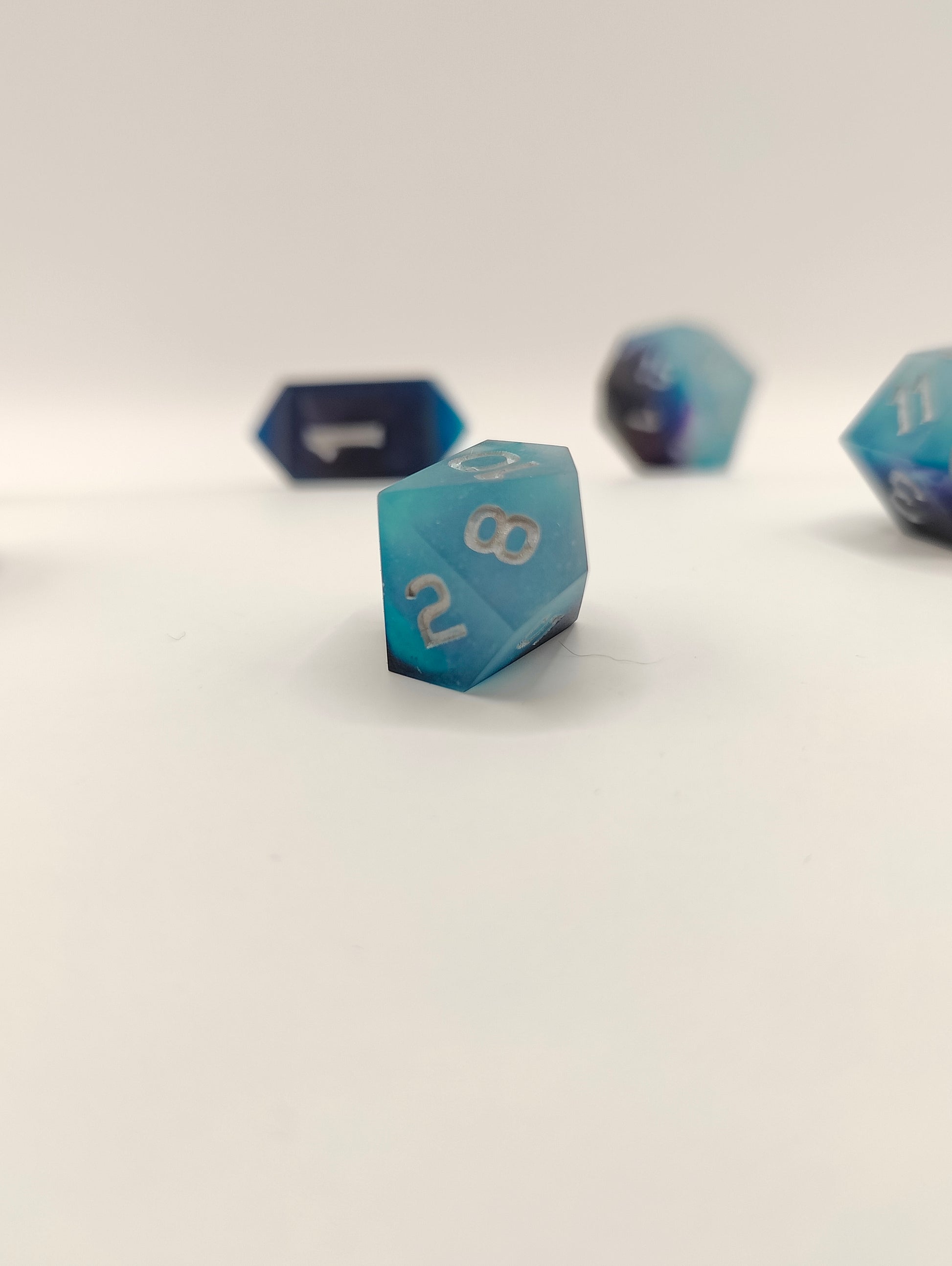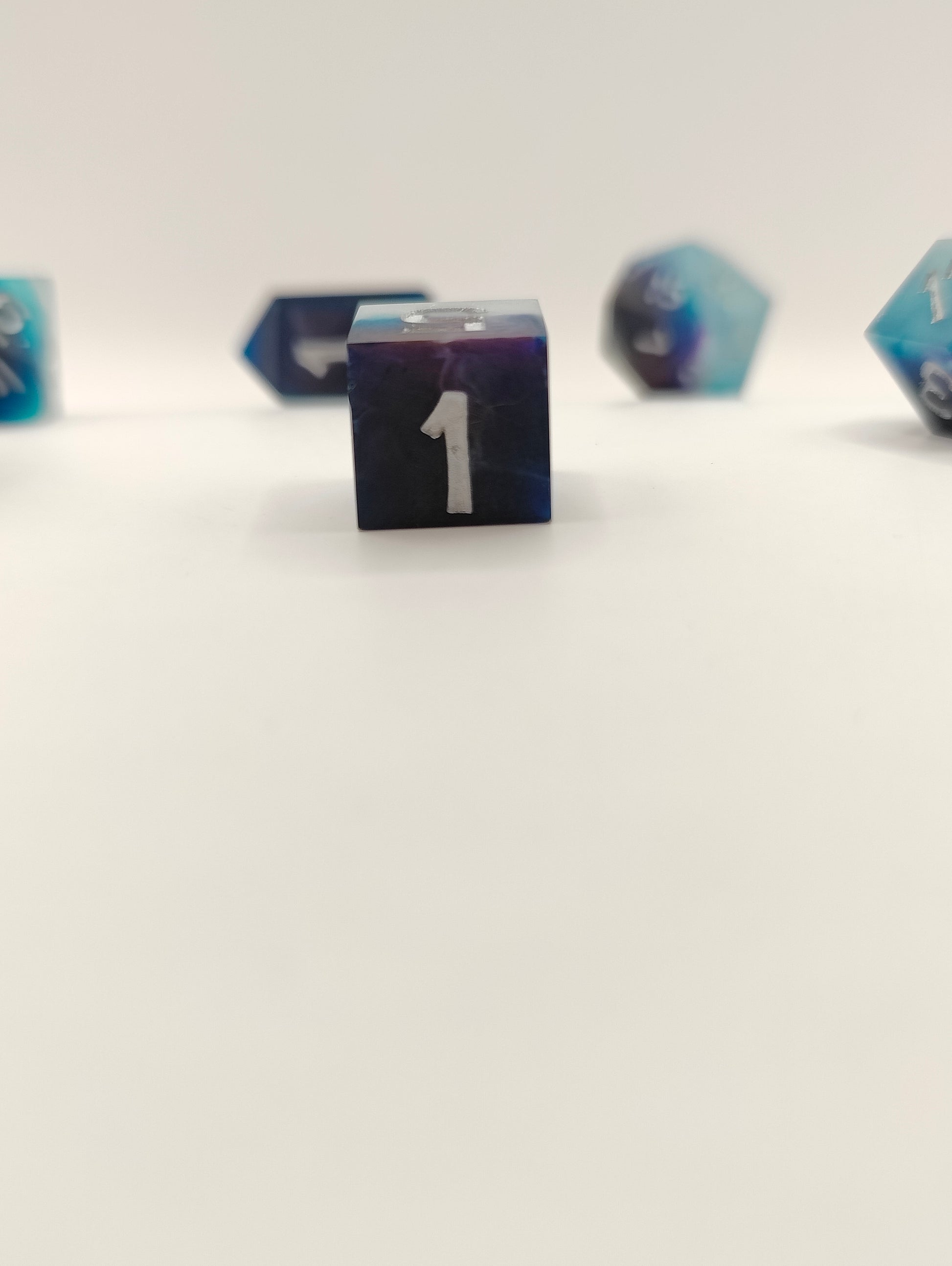 This handmade dice set was made with resin and alcohol inks. I gave this set a matte (non shiny) finish to fit the design. This set was made in a pressure pot, with my own molds, font and logo. Since these are handmade they might have slight sanding/polishing marks.