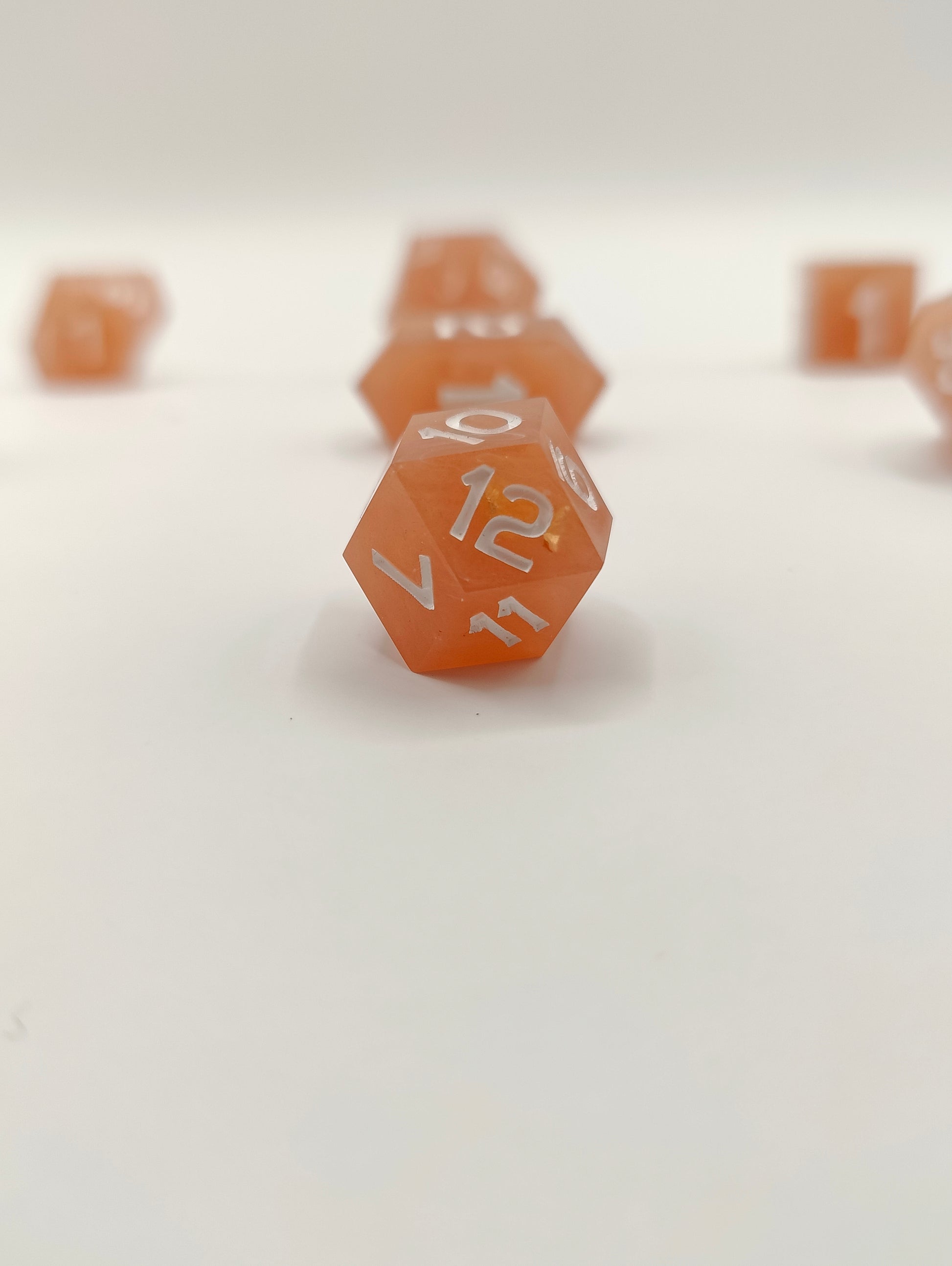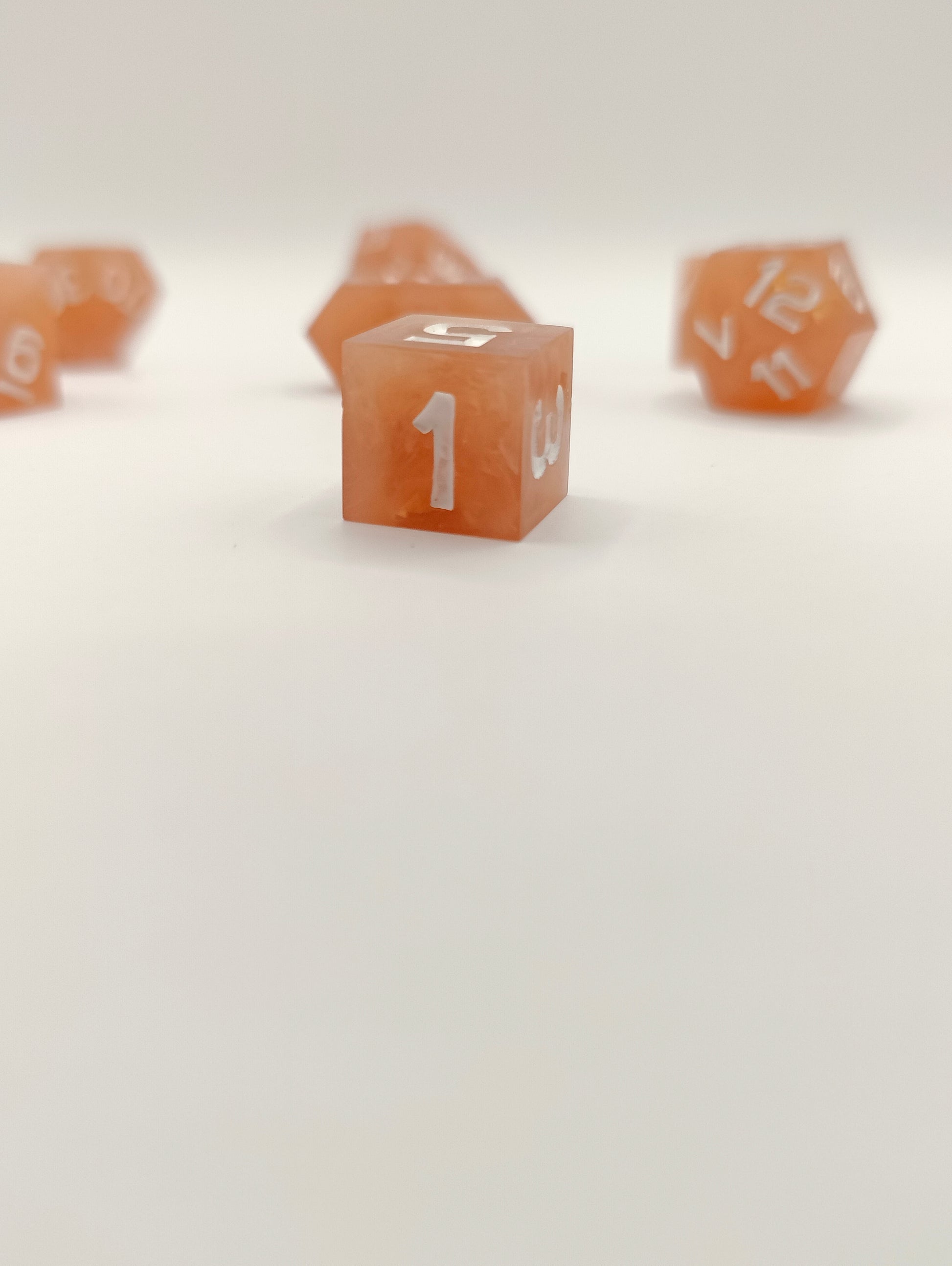 This handmade dice set was made with resin and alcohol inks. This set has a matte finish. This set was made in a pressure pot, with my own molds, font and logo. Since these are handmade they might have slight sanding/polishing marks.